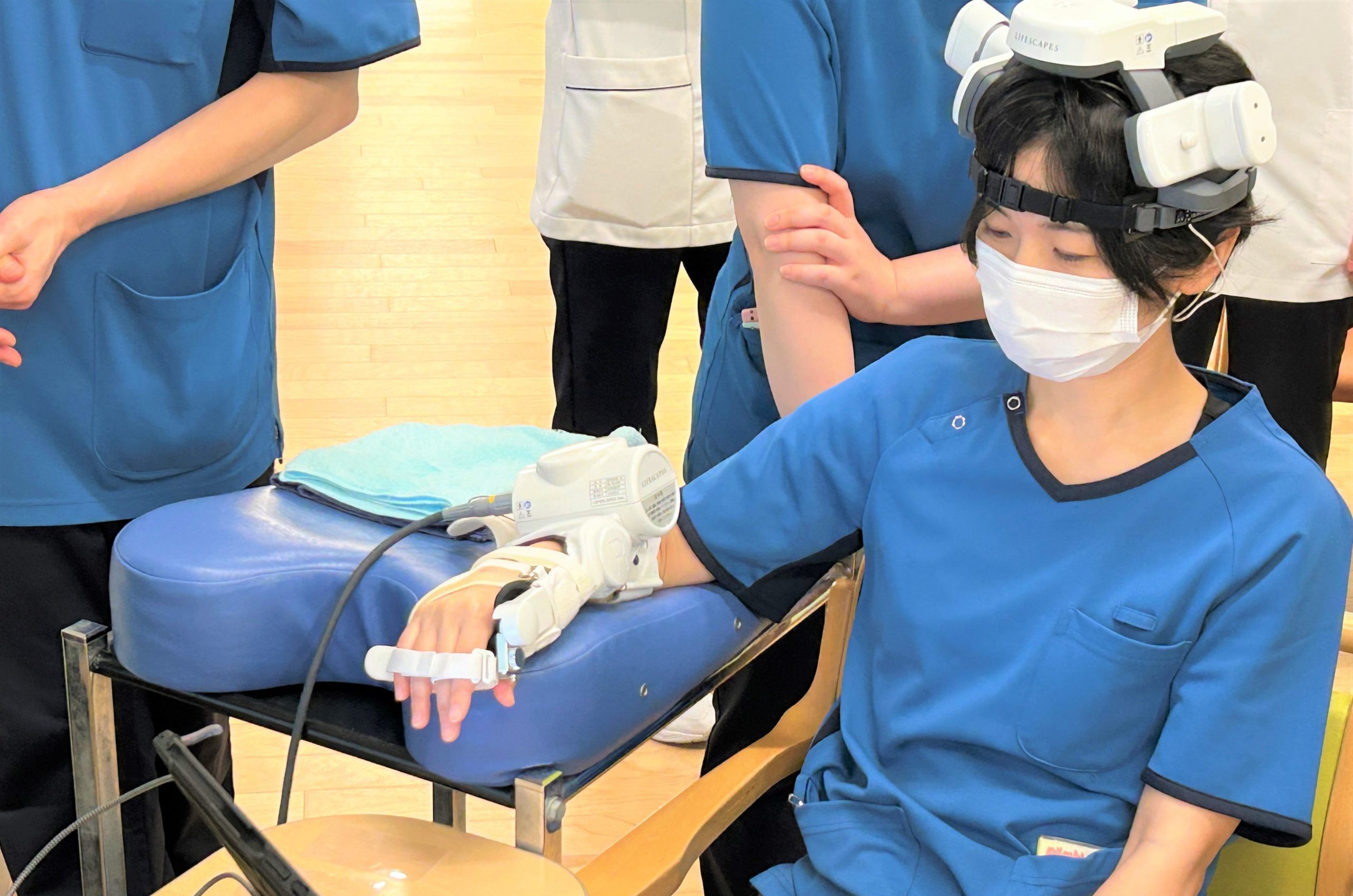 BMI(手指タイプ)は、アプローチが難しい重度の手指麻痺から、ぎこちなさが残る中等度から軽度まで広く利用可能なニューロリハビリテーション医療機器となります。頭部にヘッドセット、麻痺側上肢に電動装具を装着し、患者さまが指を伸ばそうとされる生体信号を読み取り、正しい運動イメージが行えた際に電気刺激と電動装具が駆動することで機能回復を図ります。当院においても安全使用講習を受けたリハスタッフが適用となる患者さまへ新たなリハビリテーション訓練の一つとして実施しております。
